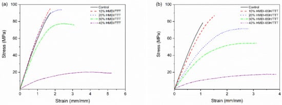 In this study, when the content of HMDI-6SH/TTT thiol-ene reached 40 wt%, the crosslink density of the resin system was reduced due to chain transfer through the network formation leading to lower crosslink density. The polymer chains become looser, and the resin changes from a glassy state to a rubbery state. The dramatical reduction of flexural strength and flexural modulus of 40%HDMI-6SH/TTT also confirmed the hypothesis (Table 5). It was the reason why the volumetric shrinkage of 40%HDMI-6SH/TTT reduced dramatically compared to other resins systems.