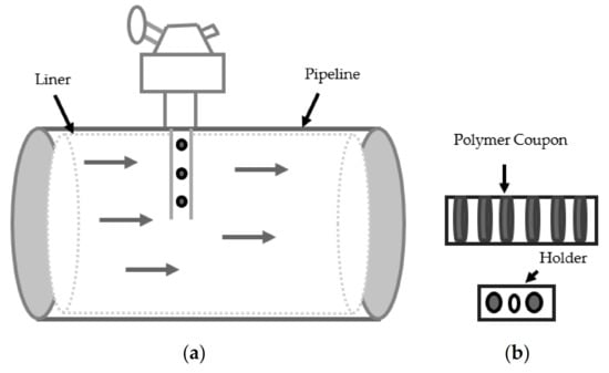 (a) Polymer coupon in the pipeline, (b) coupon and holder.