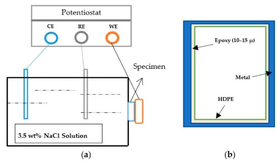 There are two main ways to plot impedance spectra, Bode and Nyquist. Nyquist is sensitive to changes; imaginary impedance was plotted versus the real part of impedance, while for Bode, the total impedance is plotted versus frequency and the phase shift. For the EIS test, we use our samples as a coating. Therefore, four carbon steel plates have the exact dimensions as the HDPE samples that were used for this purpose. The epoxy adhesive was applied on the sides of the HDPE sample and metal plate making a 10–15 microns thick layer. The prepared sample for the EIS test and the EIS setup is shown in Figure 2a,b.