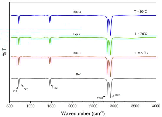 The bands around and 720 and 1468 are due to the vibrational deformation band of the methylene group. The peaks around 725–730 demonstrate connected methylene; as the exposure temperature increases, the wavenumber shifted from lower to higher values (729 cm−1), showing the decline of molecular chain length [,]. The chain-breaking de-fines the aging of HDPE with the characteristic group including 1368 cm−1 []. The peak around 1368 cm−1 is due to external hydrogen vibrations of CH2 [,] or wagging deformation of methylene groups. The appearance of peaks in these bands can be attributed to the presence of side-chain branches of PE [,]. The band around 1262 cm−1 (methyl) shows the process of chain scission because it appears in all the experiments since methyl served as the end group in molecular chains [,].