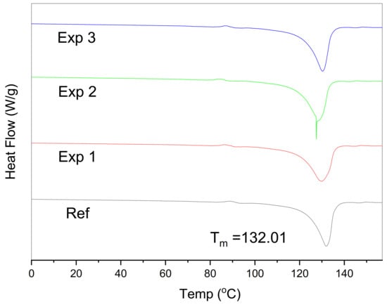 The Tm of the virgin sample is 132.01 °C. The step between 80 and 100 °C is typically due to smaller crystals, and probably they were made due to some processing. It can be due to the inclusion of additives, pigments, or simple thermal or physical processing [] of the material before being tested in the DSC, as shown in Figure 6. Figure A1, Figure A2, Figure A3 and Figure A4 have been shown in Appendix A for representing Tg values. The experimental values for Tm, Tg, and Xc were in Table 5.