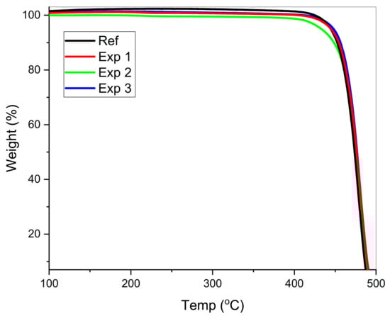 The weight loss in terms of T5% and T10% is more significant in experiments 1 and 2; this is due to the chain breaking and scission in the aged sample supported by the DSC thermograms. The values for T5% and T10% decreased in the first two experiments due to a drop in crystallinity factor []. Alcohol and hydroxyl groups appeared as a degradation product, as seen by the FTIR spectrum. As soon the branching disappears at a high temperature, the temperature drops down, as shown in Table 6 and Figure 7 [,]. The material got thermally stable due to higher crystallinity values at higher temperatures in experiment 3. The changes in the thermal decomposition temperatures show the clear effect of polymer structure (branch content) on a thermogravimetric curve.