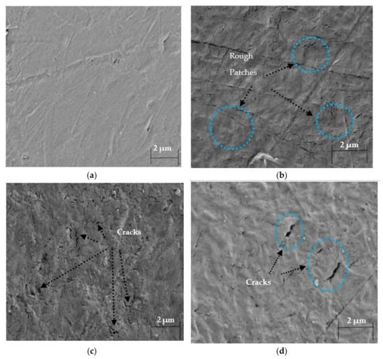 FESEM micrographs for virgin and aged samples.(a) Reference, (b) Experiment 1, (c) Experiment 2, (d) Experiment 3.