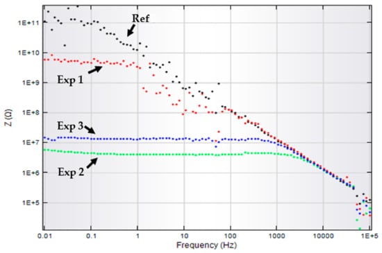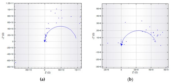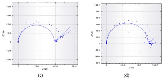 After CO2 exposure, the crystallinity decreases, indicating aging within the sample as well as the occurrence of roughness and microcracks. Nyquist plots show us the diffusion mechanism within the sample at lower frequencies as illustrated by the Warburg diffusion mechanism. The data points are dispersed as seen in the Nyquist plot and this electrochemical noise is probably due to high sample thickness. Thick and high-quality coatings have almost infinite resistance with low capacitance [,]. Due to this feature, we get minimal current values, and resistive elements in the model dominate []. The difference in impedance values is quite prominent in lower frequencies. We have seen the diffusion mechanism in experiments 2 and 3, while the Zw increases at higher temperatures. The EEC values for virgin and aged samples are shown in Table 7.