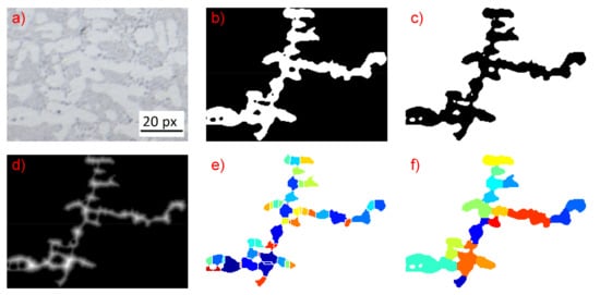 Procedure for decomposing of complex objects; (a) crop of the original micrograph showing a complex dendritic scheme. (b,c) Binarization of the dendritic scheme. (d) this approach shows a tendency for over-segmentation of the image. (e) In order to resolve this issue, a post-processing step is required that merges the individual watershed regions in such a way that the individual dendrite arms can be identified. To this end, neighborhood relations are defined for all watershed regions on the basis of a 4/8-connected neighborhood. (f) Afterwards, a procedure is initiated that aims at merging two neighboring watershed regions to a single one.