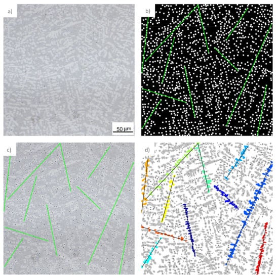 To this end, the centroid coordinates of all segmented objects are calculated and transferred into a binary mask. A dilation operation is afterwards performed on this centroid mask with a square-shapes structuring element having a size of 10 pixels. This dilation is performed in order to improve the performance of the subsequent clustering step, which is based on a Hough transform. This Hough transform detects straight lines in the centroid mask which intersect with a maximal number of pixels within the mask, as shown in Figure 3b. An initial clustering of the segmented objects is achieved by this approach by considering the set of all segmented objects that intersect with an individual line as one cluster. Since the only information employed for the objects clustering are the positions of the object centroids, it has to be expected that the majority of the detected clusters contain dendrite arms belonging to more than just one dendrite branch (see for example Figure 3c. Therefore, these clusters cannot be considered as suitable for measuring the SDAS. However, as the number of detected lines—and thus object clusters—is relatively large (about 4000 for typical image sizes of 1 megapixel), it can be safely assumed that a sufficiently large number of object clusters is in fact suitable for SDAS measurement. Therefore, the remainder of this algorithm is dedicated to the identification of these suitable object clusters from the set of all object clusters. This identification is based on the following requirements and observations: