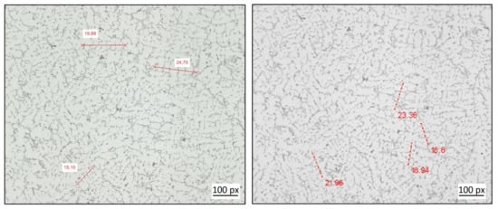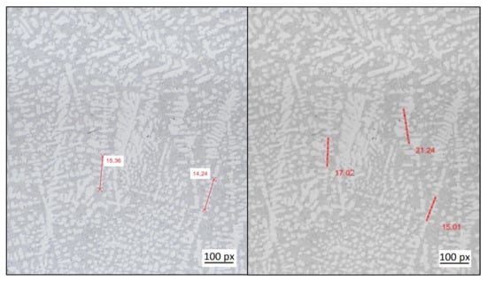 Hence, there seems to be a tendency, that there is an influence of the object size on the time requirement. As explained above, the size of the objects that are extracted from the binary image seems to influence the computational performance for the automated SDAS measurement. For the two microstructures investigated for the purpose of this work, the difference in time requirement between the manual and automated measurement procedures is more pronounced for structure 1 than for structure 2. Thus, we assess that there is a pronounced influence due to the fraction of the eutectic solid solution on the computational performance. The decreasing fraction of eutectic solid solution decreases the time required for it to be processed by the algorithm. Measuring the SDAS manually, the operator has to draw a line through the secondary dendrite arms, which is very time consuming. The assessment of the values in Figure 8, in consideration of the standard deviation bars, reveals that the automated measure procedure seems to be faster than a manual operator. The difference between a manual and an automated measurement of the SDAS is influenced depending on the fraction of eutectic solid solution of the microstructure. Independently of this time requirement advantage, the automated measure procedure requires less human resources compared to a manual measure procedure.