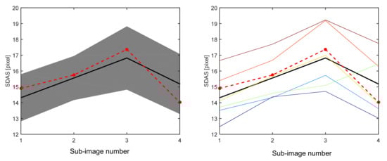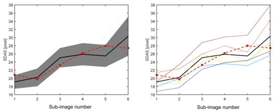 The automated SDAS measurements are shown as thick dashed lines in both subfigures. It is apparent, that some deviations to the average manual SDAS values occur. Nevertheless, these deviations are about the same order of magnitude as the standard deviation of the distribution of the manual measurements. In fact, only the automated SDAS measurement of the first sub-image is slightly outside of the region spanned by these standard deviations, while all other SDAS values lie within this region. From a statistical point of view, this observation indicates that the hypothesis that the automated SDAS measurements differ significantly from the manual ones needs to be rejected. This conclusion appears also to hold if systematic deviations between automated and manual measurements are considered, as no significant bias towards higher of lower SDAS values is apparent from Figure 5.