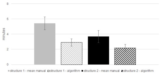 Mean time requirements per sub-image; mean manual–structure 1 (grey), algorithm–structure 1 (grey, dashed), mean manual–structure 2 (black), algorithm–structure 1 (black, dashed).