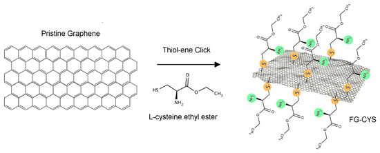 Covalent attachment of organic functional groups to the graphene surface can be achieved either by chemical reaction of free radicals or dienophiles sp2 carbons of pristine graphene, or by the formation of a covalent bond between organic molecules and the oxygen groups of graphene oxide, GO [4]. The radical-mediated thiol-ene reaction that directly attacks the sp2 carbon in the graphene framework appears to be a promising covalent functionalization approach that offers several benefits. It is highly efficient, simple to execute, insensitive to oxygen and water, has no side products and proceeds rapidly with high yield [6]. Several examples in the literature have showcased the application of thiol-ene click functionalization on GO, including our recent studies that demonstrated the use of thiol-ene modified GO with cysteamine and pentaerythritol tetrakis(3-mercaptopropionate) through both thermal and photoinitiated approaches for the removal of water pollutants [7,8,9,10,11,12]. Thiol-ene click reaction has been proven for the chemical modification of graphene oxide (GO), and the thiol-ene clicked GO serves as an excellent host matrix for platinum nanoparticles for catalytic and sensing applications [12]. In another example, one-step thiol-ene click reaction by mercaptosuccinic acid was used to prepare graphene quantum dots (GQDs) decorated with a number of carboxyl groups on the surface which improved their dispersibility in water [13].