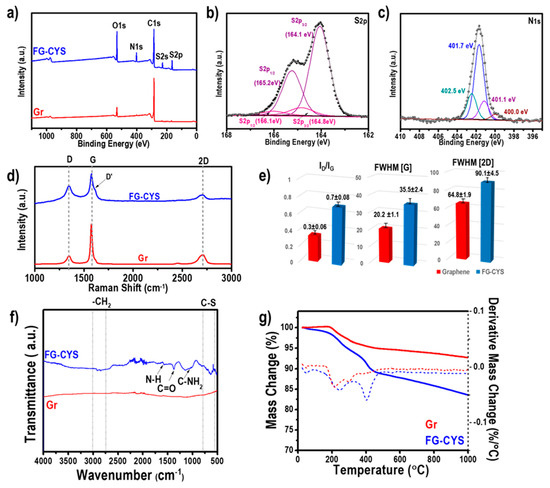 (a) XPS survey spectra of Gr and FG-CYS, deconvoluted high-resolution XPS spectra of (b) S2p and (c) N1s of Gr and FG-CYS, (d) Raman spectra, (e) ID/IG, FWHM of Raman G and FWHM of Raman 2D peak for Gr and FG-CYS, (f) FTIR spectra and (g) TGA-DTG thermograms in N2 atmosphere of Gr and FG-CYS.