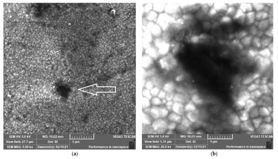 SEM images of different magnifications (×5000 (a) and ×25,000 (b)) of the ZR control sample prepared by CAD/CAM. The morphology of ZR is characterized by grains (250–500 nm), grain boundaries and several voids (0.5–5 μm in diameter). Symbol reference: white arrow indicates hole/void.