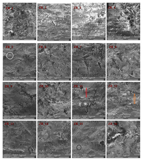 The sandblasting effect can be observed in Figure 2. The typical Y-TZP morphology (Figure 1) is no longer present as there are no well-defined grain boundaries. According to references [22,27], the kinetic energy of the Al2O3 particle during the sandblasting is high enough to induce surface melting of the zirconia-based materials. These deformations usually occur due to internal tensile stress and increased temperature induced by the Al2O3 air-abrasion [27]. Figure 2 also clearly shows that the surfaces of the sandblasted samples (vs. the ZR control sample) are drastically perturbed as the impact of Al2O3 particles yielded surface damages, such as large cracks (orange arrow), micro-cracks (red arrow), holes (white arrow), surface melting (black circle) and plastic deformations (white circle). However, it appears that the ZR_2 sample (Table 1) shows the lowest portion of surface defects (Figure 2). The presence of these defects is expected as they were also reported in the literature [22,27,28]. These defects also increase roughness which promotes formation of superficial cracks that reduce the strength of restoration [15]. In addition, it was also explained that minor defects obtained by air-abrasion could be “healed” by resin luting agents [45].