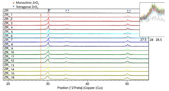 To further investigate Y-TZP structural (and volume) changes discussed in this study, PXRD patterns of the ZR control and the sandblasted samples are given in Figure 3. PXRD is very applicable when studying diverse zirconia-based materials [12,28,29,50,51]. Figure 3 shows the presence of the tetragonal phase (but not the monoclinic phase), identified by the PCPDF2 card no. 01-088-1007, in the ZR sample. The above-mentioned tetragonal form of zirconia is responsible for the materials’ strength and toughness [52].