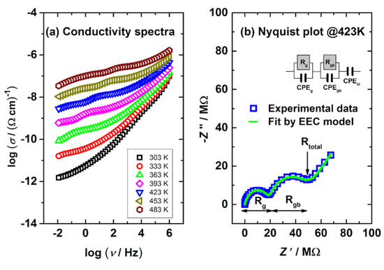 Next, complex Nyquist spectra (Figure 4b) obtained at 423 K display 2 arcs, a feature that corresponds well to the literature (e.g., [17]). The first arc in Figure 4b (characterized by Rg) located in the high-frequency region can be attributed to intergrain (i.e., lattice) conductivity, while the second one (defined by Rgb) can be assigned to intragrain (i.e., grain boundaries) [25]. Furthermore, the spur at low frequencies (a straight line in Figure 4a) is due to the surface-electrode effect. The proposed interpretation refers to ceramics, but it can be also used for any other solid materials with conductive crystalline grains, grain boundaries and similar conduction mechanism [56,57,58].