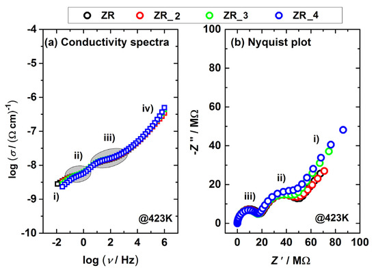 (a) Conductivity and (b) Nyquist spectra obtained at 423 K for selected samples (the control ZR and the sandblasted ZR_2, ZR_3, ZR_4). Different regions are marked as follows: (i) decrease/spur at lowest frequencies, (ii) low-frequency, (iii) middle-frequency region and (iv) dispersion (frequency-dependent region).