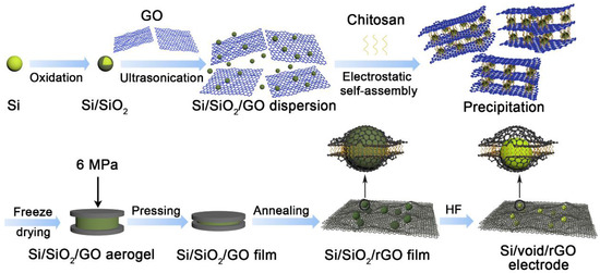 In this study, we have successfully prepared a free-standing Si/void/rGO yolk–shell structured electrode via electrostatic self-assembly using protonated chitosan. The free-standing composite electrode has high flexibility and good mechanical properties, maintains the integrity of the electrode, and can be directly used as a working electrode of a lithium-ion battery without adding other binders and conductive agents. The Si nanoparticles are evenly coated between the graphene sheets, which effectively avoids direct contact between the Si and the electrolyte, and promotes the formation of a stable SEI film. At the same time, graphene has good flexibility and conductivity, which can buffer the volume expansion of Si and improve the conductivity of composite materials. In addition, in the yolk–shell structure, the space reserved around the Si particles can further buffer the damage of the structure caused by the huge volume change in Si during the charge/discharge process, thereby improving the cycle performance of the battery.