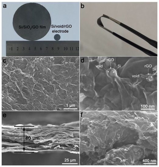 (a,b) Photographs of Si/SiO2/GO aerogel after compression and free-standing Si/void/rGO electrode; (c,d) surface SEM images of the free-standing Si/void/rGO electrode at different magnifications; (e,f) cross-section SEM images of the free-standing Si/void/rGO electrode at different magnifications.