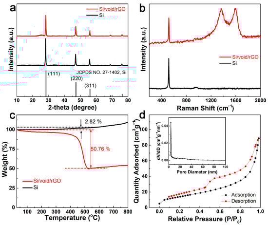 (a) XRD patterns and (b) Raman scattering spectra of free-standing Si/void/rGO electrode and Si; (c) TG curve and (d) N2 adsorption–desorption isotherm and the corresponding pore size distribution of free-standing Si/void/rGO electrode.