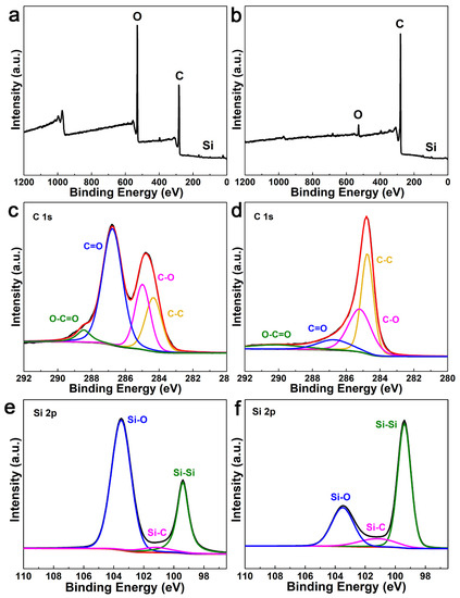 The X-ray photoelectron spectroscopy (XPS) was used to further characterize the chemical state of carbon in the Si/void/rGO composite electrode. Figure 4a,b are the XPS spectra of the Si/SiO2/GO film and free-standing Si/void/rGO electrode samples. The spectra show that the Si/SiO2/GO film and the free-standing Si/void/rGO electrode both contain the three elements of Si, O and C. Figure 4c,d are the C1s spectra of the Si/SiO2/GO film and the free-standing Si/void/rGO electrode, showing the presence of different oxygen-containing functional groups in the sample. The four peaks at 284.0, 285.2, 288 and 289.2 eV correspond to the C=C/C–C, C–O, C=O and COOH groups, respectively [35,36]. However, compared with the Si/SiO2/GO film, the peak intensity of the oxygen-containing functional groups of the free-standing Si/void/rGO electrode composite is significantly weakened, which indicates that thermal reduction at 900 °C for 2 h can effectively remove most of the oxygen-containing functional groups of GO, which improves the conductivity of the composite electrode. As shown in Figure 4e, the Si 2p spectrum of the Si/SiO2/GO film can be deconvolved into three contributions. One dominant peak at 103.5 eV corresponds to the bonding of Si–O. The second peak located at 103.5 eV corresponds to the bonding of Si–Si. The third relatively weak peak located at 101.2 eV is attributed to a very small amount of Si–C [37]. The Si 2p spectrum of the free-standing Si/void/rGO electrode is shown in Figure 4f. The positions of the three peaks are still the same as before, but the strength of the peaks change accordingly. The peak of the Si–Si bond is significantly enhanced with an obvious decreased peak intensity of the Si–O bond, indicating that most of the SiO2 had been removed after the HF treatment. In addition, the peak of the Si–C bond had increased, indicating that the interaction between Si and C was enhanced by calcining, which was beneficial to improve the conductivity of the material.