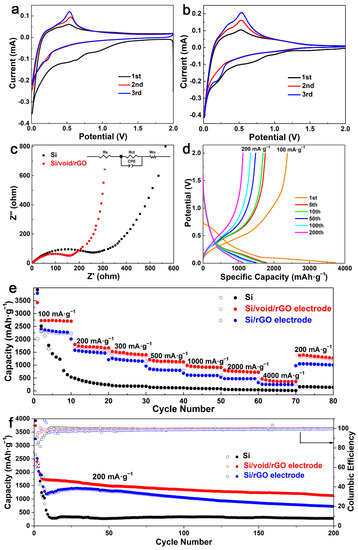 Cyclic voltammetry (CV) curves of the (a) free-standing Si/void/rGO electrode and (b) bare Si anode, (c) electrochemical impedance spectroscopy (EIS) spectrum and fitted equivalent circuit diagram, (d) charge/discharge profiles of the free-standing Si/void/rGO electrode at 1st, 5th, 10th, 50th, 100th and 200th cycles, (e) rate performance at various current densities, and (f) cycling performance and coulombic efficiency (CE) at 200 mA·g−1 of the free-standing Si/void/rGO electrode, Si/rGO electrode and bare Si electrode.