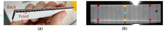 In this study, the specimen was also tested using optical extensometry. Two cameras were used to track the deformation of both faces to account for the out-of-plane bending produced by the non-symmetrical section. The front face is the higher flute, while the back face is the lower flute of the paperboard, see Figure 5a. Each of the two faces of the specimen was marked with three sets of dots in order to enable point tracking. In Figure 5b, one can observe the sets of points on one of these faces. The single set of points, marked in this figure by squares connected by a dotted line, is a virtual extensometer, for which the extension is observed during the test. The video extensometry was performed using MatchID DIC platform (v. 2020.2.0, MatchID, Ghent, Belgium). The specimen was sandwiched between two platens and aligned using 3D printed L-brackets.