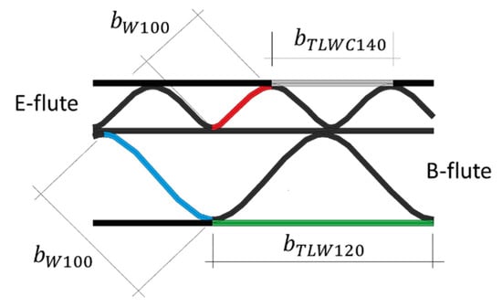 In the research, 5-layer corrugated cardboard named 5EB650C3, produced in Aquila Września—the Polish branch of the VPK Group—was used. This grade consists of an external coated layer of a white recycled base liner board with a grammage of 140 g/m2. Both corrugated layers (E and B flutes) and the flat layer in between are made from lightweight recycled fluting WB with a grammage of 100 g/m2. As an internal layer again the white test liner with a grammage of 120 g/m2 was used. The arrangement of individual layers and the geometry of the cardboard cross-section are shown in Figure 1.