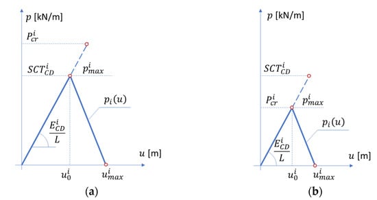 Compressive strength vs. deformation. (a) the case where the SCT is lower than the critical load of the i-th layer; (b) the case where the critical load is lower than the SCT of the i-th layer.