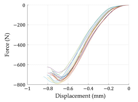 The deformation corresponding to the maximum load can be calculated from Hooke’s law considering the stiffness in the CD direction, sample height, and the compressive strength or critical load, whichever occurs first (see Figure 8). So for the i-th layer the relation takes the form: