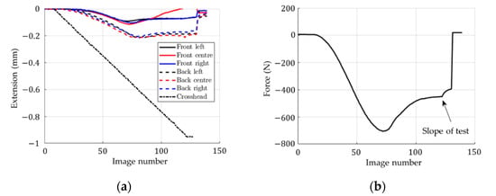 Figure 10 presents the results obtained from the video extensometry measurements. In Figure 10a, one can observe the extension in terms of the image number from the virtual extensometers on the front face (on the left side, at the center and on the right side), on the back face (on the left side, at the center and on the right side) and on the crosshead. In Figure 10b, the applied force is shown in terms of the image number. The maximum absolute value of the applied force was approximately 703 N, while the mean value obtained from the ECT measurements was equal to 751 N. However, it should be noted that a pre-load of 15 N was applied and after that the measurements started from zero value. Here, the loading rate (0.5 mm/min) was significantly slower than the typical 10 mm/min due to the limited frame rate of the cameras, which reduces the measured maximum load through relaxation.