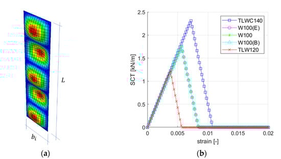 Figure 11a shows an example of the eigenmode of the individual separated i-th plate, calculated as simply supported plate loaded along the dimension. Figure 11b shows all constitutive curves, where the maximum value of the compressive load is equal to for the TLWC140 layer and all W100 layers, while for the TLW120 layer it is the critical load value due to the dimension (see Equation (2)), which is the largest in this case.