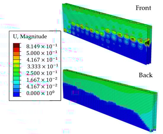 The displacements on both sides of the ECT sample in the last iteration are shown in Figure 14, where the unloaded part of the sample is shown in blue.
