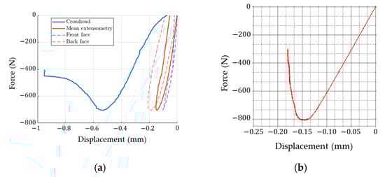 Experimental results based on non-contact full-field displacement measurements and crosshead displacement (see Figure 15a) are presented here together with the results from various predictive models. Figure 15b shows the force-displacement curve obtained from a numerical full detailed 3D FE model.