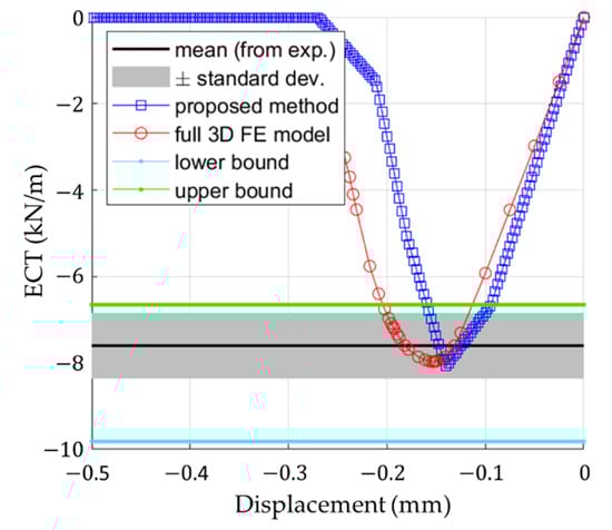 Figure 16 also shows the results of the analytical method proposed here, as well as the experimental data (mean value ± one standard deviation) and results from the numerical validation model. Table 5 summarizes all measured and computed stiffnesses and compressive strengths in CD of the corrugated board 5EB650C3.