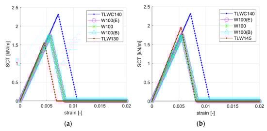 In the predictive analytical model, constitutive curves are first constructed based on the specific material parameters of the individual layers (see Table 2), based on Equations (2)–(6). The results of the buckling analysis and other parameters necessary to build the constitutive curves are summarized in Table 4.