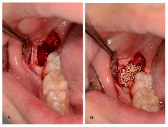 Post-extraction site (A) filled with the graft material (B) (test group).