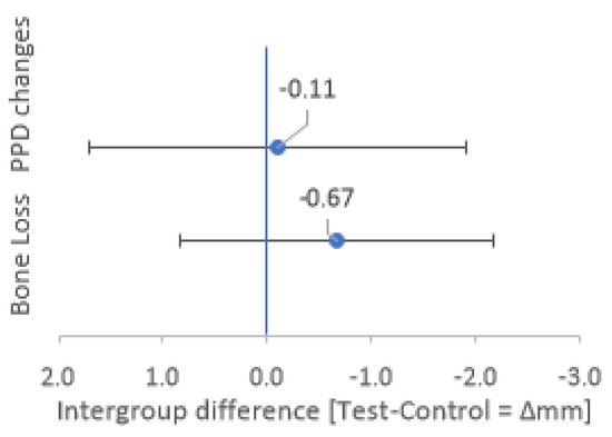 Intergroup differences for Bone Loss and PPD changes after 1 year. Mean intergroup differences (Test–Control) for Bone Loss and PPD changes after 1 year are represented by blue dots. The confidence intervals of 95% (CI95) for the intergroup differences are represented by the lower and upper whiskers.