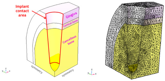 All tissues (cancellous bone, cortical bone, gingiva) were assumed to face the same micromotion as a boundary condition at the interface (= there is no assumption on the adhesion quality of the screw and the abutment, the traction is supposed just to be transferred to the contact surface). All materials (tissues) were set to “linear elastic material” in the COMSOL software, but with the customized properties described for every matrix element as by Equations (5)–(8) introducing the non-linearity and history-dependent viscoelasticity. As initial data for bone in Table 1 did not have viscoelastic components, a loss factor of 0.03 was adopted for 1 Hz based on general knowledge [9,16,21]. For gingival tissue, non-linear viscoelastic contribution was embedded in the stiffness matrix with Equation (8). The thread and shape of the screw are not included in the calculations for this demonstration (as they are implant-type specific). The base XY plane is assigned with roller conditions (no vertical Z-displacements) and symmetry planes imposed at XY and YZ planes—in this way, ¼ of the whole structure is simulated. All other surfaces are set to free displacements (Figure 2).