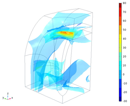 The total displacement amplitude of the tissues (μm) is shown in Figure 4. As expected, there are non-uniform, anisotropic displacements in all three tissue types, being the highest near to the implant traction surface—contact area (Figure 2, right). The maximal positive pressure appears near this interface and is the highest in the cortical bone in the X-direction (mesio-distal), Figure 5. This zone, however, is rather small (~100 μm depth) and changes into negative pressure zone deeper in the tissues. Neutral zone stays in gingival tissue and in the deeper cancellous bone, which might be considered positive from the point of view of having lower PPT and IFP values (Table 3). A detailed analysis of these threshold zones is possible, but it likely makes more sense for an exact implant shape and thread geometry.