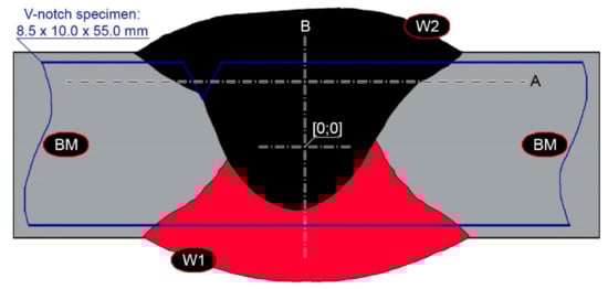 General diagram of a welded joint of Hardox 450. W1/W2—individual layers of the weld in accordance with the order of completion, A/B—lines of the executed hardness distributions, BM—parent material, the place of the V—shaped notch cut on the specimens for impact testing is schematically shown in blue.