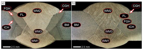 Macroscopic cross-sectional image of a welded joint of Hardox 450 steel: (a) delivery state (directly after welding), (b) normalised state. WM—weld metal zone, FL—fusion line, BM—parent metal zone, CGH(AZ)—coarse grain zone (overheating), FGH(AZ)—fine grain zone (normalisation and recrystallisation), ICH(AZ)—intercritical zone (incomplete normalisation), HAZ—heat-affected zone. Stereoscopic microscopy, etched with 3% HNO3 and Adler’s reagent.