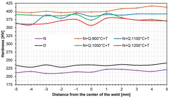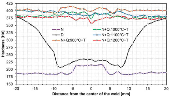 Hardness distributions of the welded joint of Hardox 450 along line B in Figure 1: D—delivery state (directly after welding), N—normalised state, Q—quenched state, T—tempering.