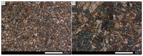 Microstructure of a welded joint of Hardox 450 steel in delivery state (directly after welding)—BM area shown in Figure 2a. (a) 100×; (b) 500×. Microstructure of low carbon quenching martensite with areas of tempering martensite. Light microscopy, etched with 3% HNO3.