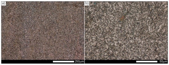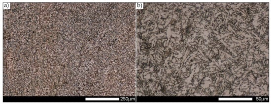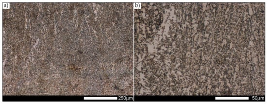 Microstructure of welded joint of Hardox 450 steel in the delivery state (directly after welding)—WM2 zone shown in Figure 2a. (a) 100×; (b) 500×. Structure of non-equilibrium ferrite grains with troostite precipitates. Light microscopy, etched with 3% HNO3.