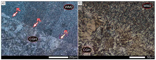 Microstructure of a welded joint of Hardox 450 in delivery state (directly after welding)—FL zone shown in Figure 2a. (a) 100×; (b) 500×. Clearly visible—narrow—fusion line, mainly consisting of sorbite and troostite structures. A very clear microstructure growth can be observed directly under the fusion line. FL—fusion line, WM2—weld metal zone, CGH(AZ)—coarse grain zone. Light microscopy, etched with 3% HNO3.