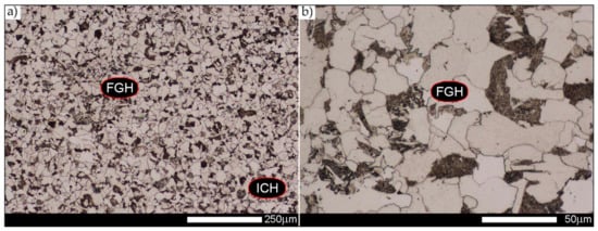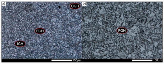 Welded joint microstructure of Hardox 450 steel in the normalised state—FGHAZ zone shown in Figure 2b. (a) 100×; (b) 500×. Structure of near-equilibrium and non-equilibrium ferrite grains with pearlite colonies. On the borders of the ferrite grains, precipitates of tertiary cementite are also observed. FGH(AZ)—fine-grained zone, ICH(AZ)—intercritical zone. Light microscopy, etched with 3% HNO3.