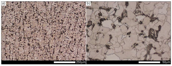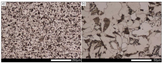 Welded joint microstructure of Hardox 450 steel in the normalised state—WM2 zone shown in Figure 2b. (a) 100×; (b) 500×. Structure consisting of near-equilibrium ferrite grains with pearlite with minor banded structure features and tertiary cementite precipitates at ferrite grain boundaries. Light microscopy, etched with 3% HNO3.