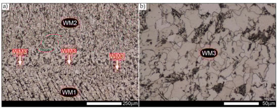 Microstructure of welded joint of Hardox 450 steel in the normalised state—WM1 zone shown in Figure 2b. (a) 100×; (b) 500×. The structure mainly consists of near-equilibrium grains of ferrite with pearlite exhibiting banded structure according to the direction of weld metal crystallisation. Some tertiary cementite precipitates are also observed at the ferrite grain boundaries. Light microscopy, etched with 3% HNO3.