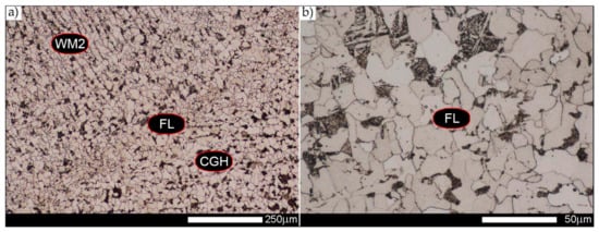 Welded joint microstructure of Hardox 450 steel in the normalised state—FL zone shown in Figure 2b. (a) 100×; (b) 500×. Structure of near-equilibrium grains of ferrite and lamellar and fine-lamellar pearlite. Tertiary cementite is also observed locally, often forming a continuous network around the ferrite grains. WM2—weld material zone 2, FL—fusion line, CGH(AZ)—coarse-grained zone. Light microscopy, etched with 3% HNO3.