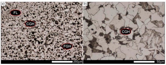 Welded joint microstructure of Hardox 450 steel in the normalised state—CGHAZ zone shown in Figure 2b. (a) 100×; (b) 500×. Structure of near-equilibrium ferrite grains with pearlite colonies. Tertiary cementite is also observed, often forming a continuous network around the ferrite grains. FL—fusion line, CGH(AZ)—coarse-grained zone, FGH(AZ)—fine-grained zone. Light microscopy, etched with 3% HNO3.